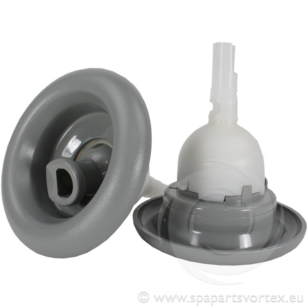 Cikloninis purkštukas, reguliuojamas sūkurys, tekstūruotas, pilkas, skirtas naudoti SPA ir kubilų sistemose. Jis turi reguliuojamą sūkurį vandens srautui reguliuoti ir pasukamą jungtį. Norėdami pritvirtinti, paspauskite ir pasukite, kol užsifiksuos.