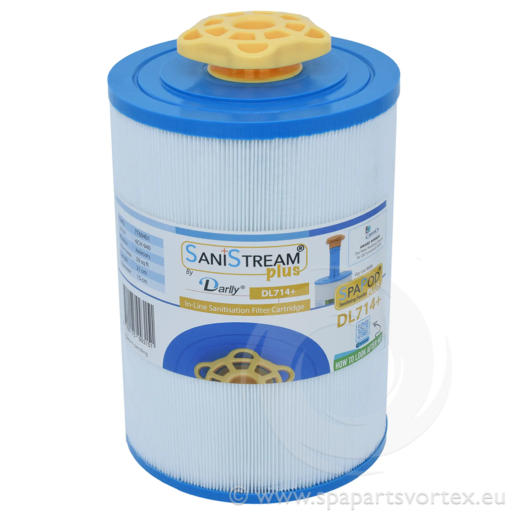 „Darlly Sanistream DL714+“ yra klostuotas kasetinis filtras, skirtas sūkurinėms vonioms, naudojančioms „SaniStream Direct Line“ filtravimo sistemą. Jis turi nuimamą viršų, skirtą „SpaPod“ dezinfekavimo priemonės dozatoriui (parduodamas atskirai). Sūkurinės vonios: „Allseas Spas“, „Armstark“, „Aspen Spas“, „Blue Whale Spas“, „Canadian Spas“, „Catalina Spas“, „Clearwater Spas“, „Crest Spas Europe“, „Dynasty Spas“, „Elite Spas“, „Freestyle Spas“, „Infinity Spa“, Jacuzzi, „LA Spas“, „Leisure Bay Spas“, „Nordpool Spa“, „Palm Spas“, „Passion Spas“, „Spa Crest“, „Spaform“, „Sun Spas“, „Sunbelt Spas“, „Sunrise Spas“, „Superior Spas“, „Svenska Bad“, terminiai SPA, „Tuff Spas“. Specifikacijos: Filtro tipas: Klojuota kasetė. Ilgis: 210 mm. Skersmuo: 150 mm. Filtravimo plotas: 50 kv. pėdų. Viršuje: Nuimama rankena. Apačioje: 38 mm (1,5 colio) vidinis šiurkštus (SAE) sriegis. Suderinamas su: „SaniStream Direct Line“ filtravimo sistema. sistema